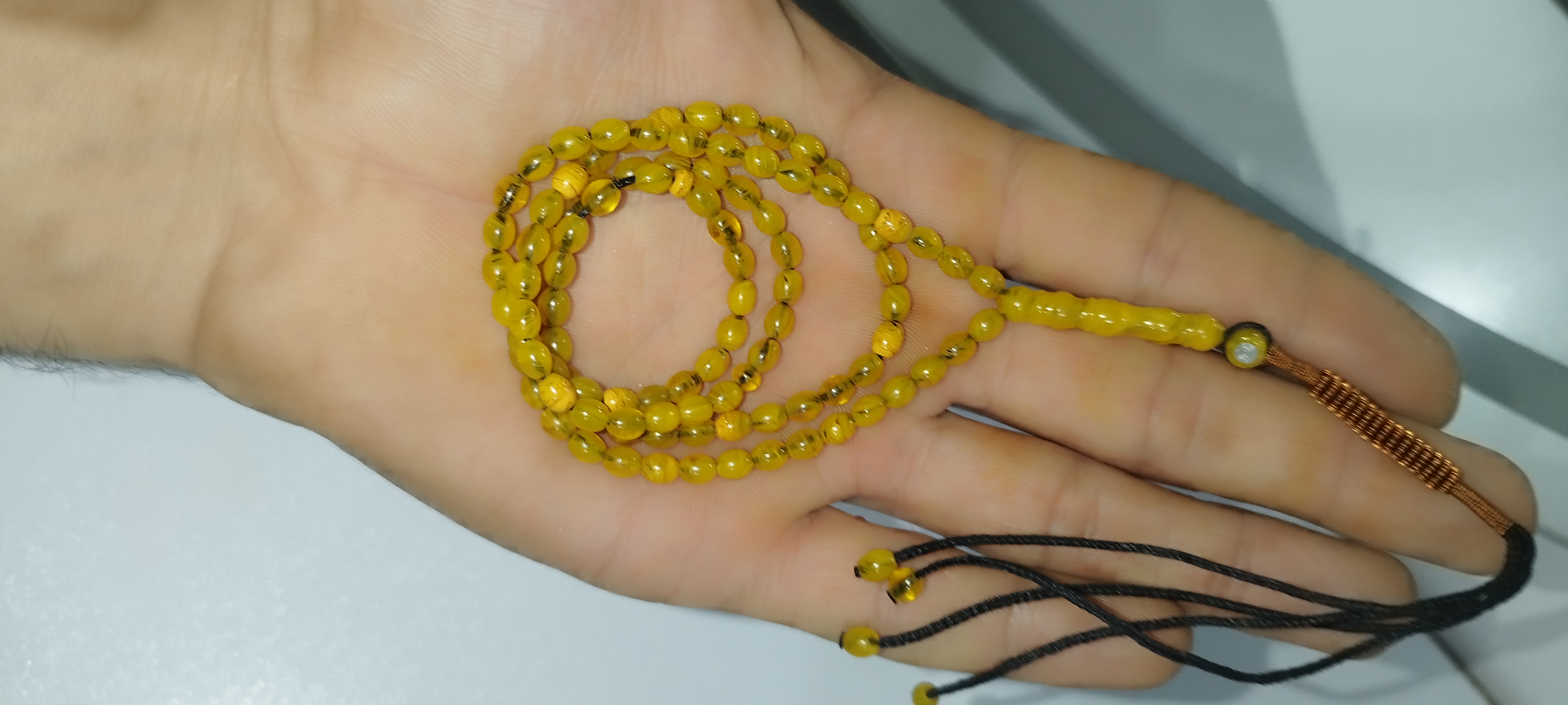کهربا زرد رگه دار 101عددی تراش گندمی ریز مهر نقره دنباله دار جنس بودار ومتریال درجه 1